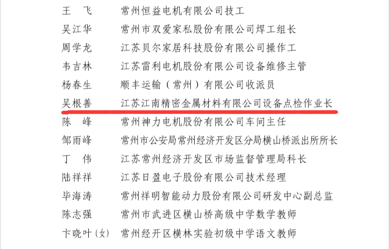 集團旗下江蘇江南精密金屬材料有限公司設備部點檢作業長吳根善被授予“常州市五一勞動獎章”。吳根善2004年進入江南精密,擔任設備點檢員,負責設備的安裝調試工作,2010年提拔為設備點檢作業長,負責全廠設備的日常點檢和維護工作。期間積極提出合理化建議并付諸行動,一個個“金點子”轉化為“金果實”,為公司帶來實實在在的效益。在公司降本增效的號召下,改造鍍鋅鍋爐余熱回收裝置,將退火爐尾氣熱能回收利用,每年為公司節省170萬元。他推動部分進口備件逐步實現國產化,為公司節約維護成本。鍍鋅鋅鍋工作環境差(高溫、噪音),他自主設計自動加鋅裝置替代傳統人工手動加鋅,達到安全、高效生產。由于工作表現突出,連續多年被評為“年度先進工作者”,并于2019年榮獲“武進金牌工人”榮譽稱號。